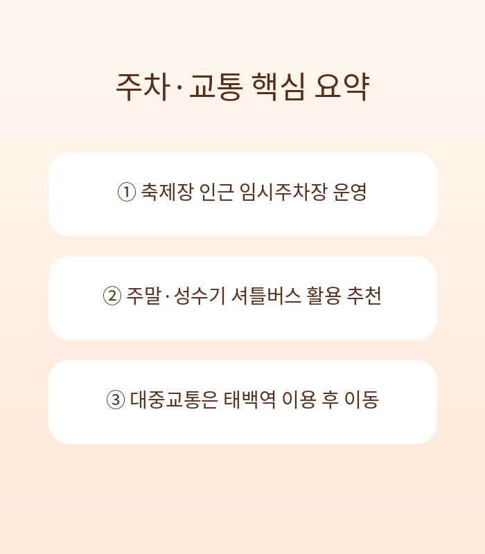 - 주말·성수기에는 축제장 인근 교통 혼잡이 잦아 대중교통 또는 셔틀 이용이 편하다.