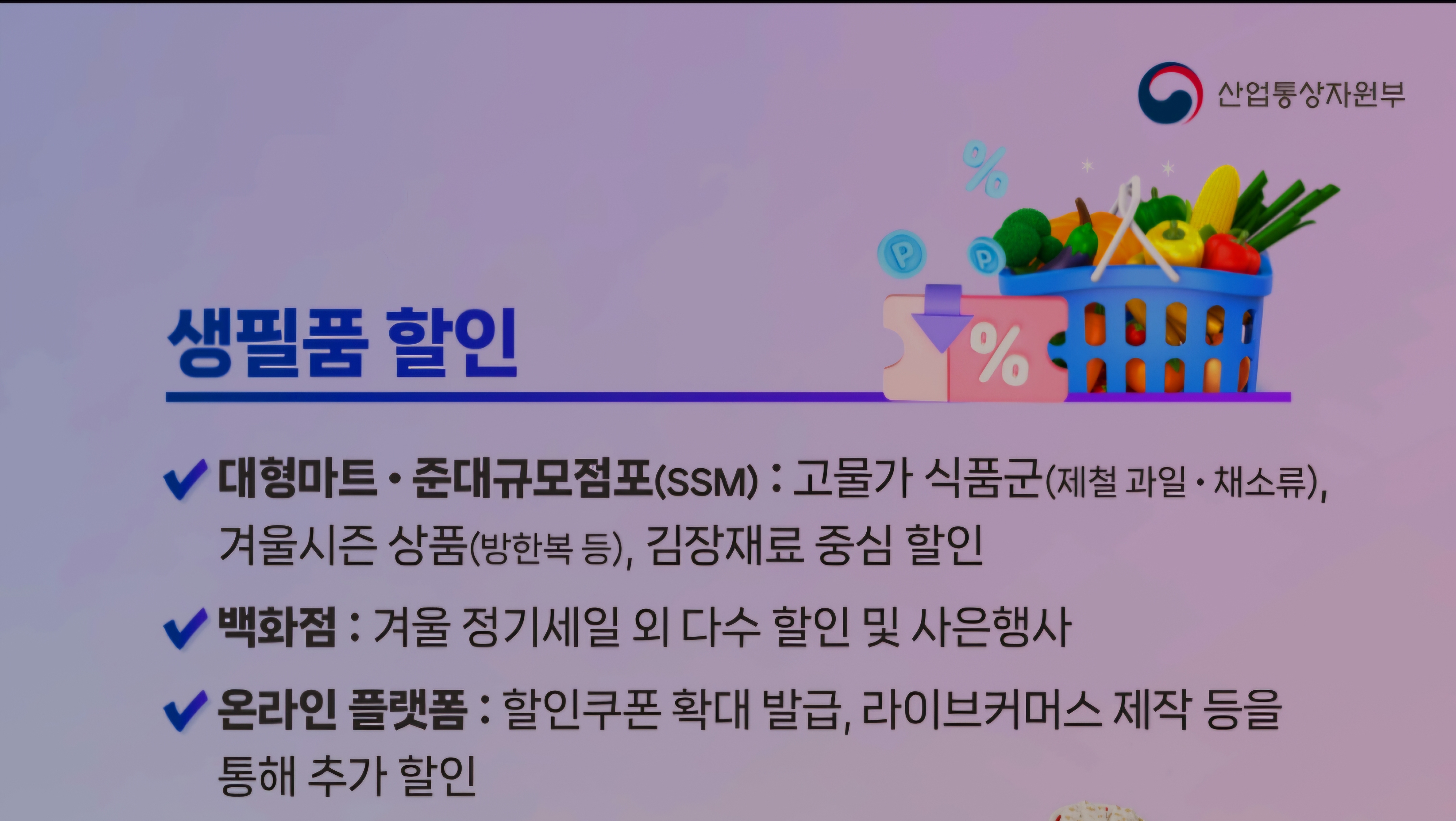- 대형마트·준대규모점포(SSM): 고물가 식품군(제철 과일·채소류), 겨울시즌 상품(방한복 등), 김장재료 중심 할인