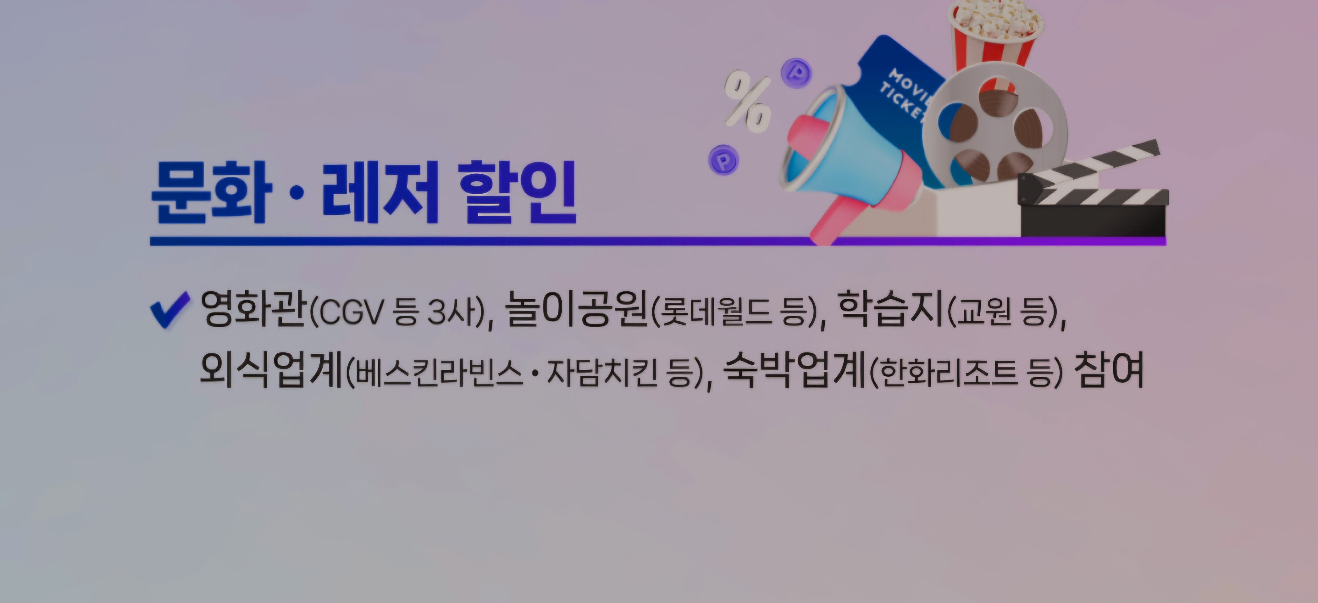 - 영화관 (CGV 등 3사), 놀이공원 (롯데월드 등), 학습지 (교원 등), 외식업계 (배스킨라빈스/ 자담치킨 등), 숙박업계 (한화리조트 등) 참여