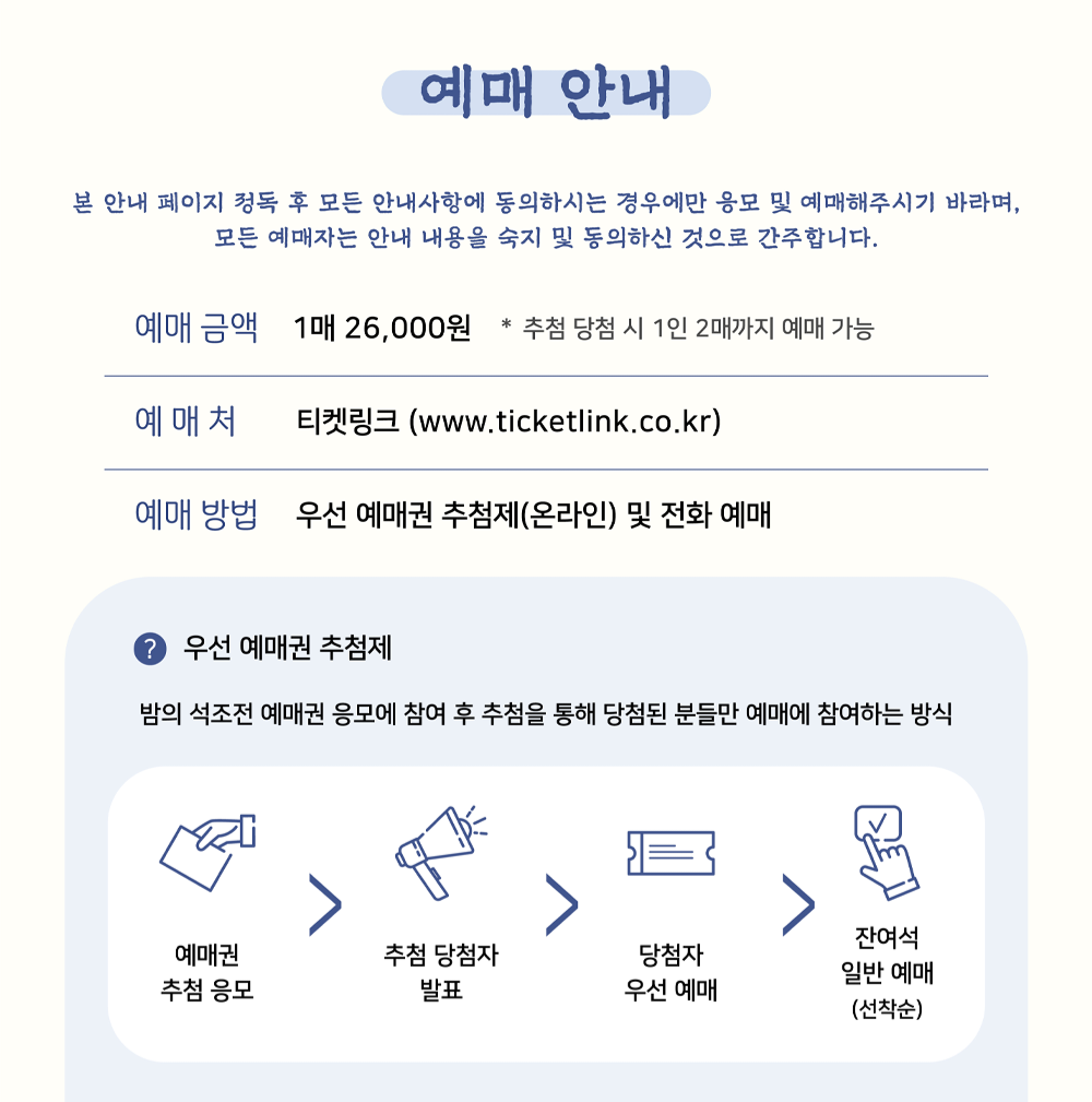 - 예매 금액: 1매 26,000원 *추첨 당첨 시 1인 2매까지 예매 가능