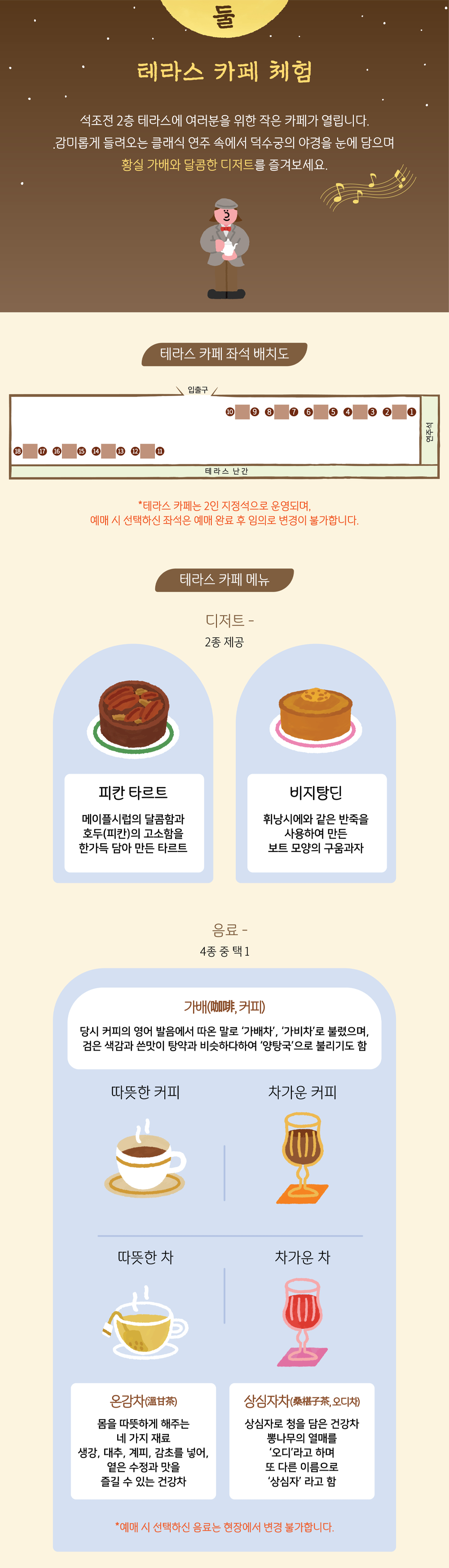 석조전 2층 테라스에 여러분들을 위한 작은 카페가 열립니다. 감미롭게 들려오는 클래식 연주 속에서 덕수궁의 야경을 눈에 담으며 황실 가벼와 달콤한 디저트를 즐길 수 있습니다.