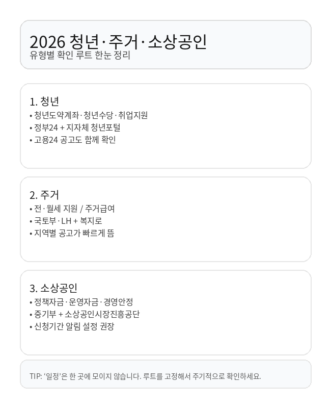 - 청년·주거·소상공인·저소득층 유형별 확인 루트와 신청 준비 체크리스트를 정리했습니다.