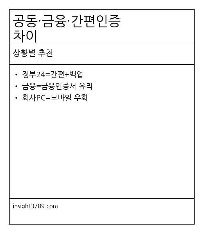 공동인증서는 예전 공인인증서의 계열로, 금융/민원/각종 서비스에서 폭넓게 쓰이는 “범용성”이 장점입니다. 다만 PC 환경에서는 보안 프로그램 설치, 인증서 파일 관리, 브라우저 팝업 등에서 막히는 경우가 많습니다. 금융인증서는 금융권 중심으로 간편하게 쓰도록 만든 인증 방식으로, 사용 경험이 비교적 단순하고 관리가 쉬운 편입니다. 특정 환경(은행 앱/금융 서비스)에서는 금융인증서가 더 빠르게 통과되는 경우가 많아 “금융 중심 업무”에 유리합니다. 간편인증은 카카오/네이버 등 앱 기반으로 인증하는 형태라, “앱에서 승인 버튼 누르는 방식”이 익숙한 분들에게 가장 편합니다. 다만 모든 사이트가 모든 간편인증을 지원하는 것은 아니어서, 지원 여부에 따라 다른 인증 수단이 필요할 수 있어요. 정리하면, 공동인증서는 범용성·호환성이 강하고, 금융인증서는 금융 업무에 효율적이며, 간편인증은 사용성이 뛰어난 대신 지원 범위가 변수가 됩니다. 회사 PC처럼 보안이 강한 환경에서는 간편인증이 가장 편하게 느껴질 때도 있지만, 사이트 정책에 따라 공동/금융 인증이 필요할 수도 있어요. 그래서 “주 사용처”를 기준으로 1개만 고르는 게 아니라, 최소 2개(간편 + 금융/공동)를 준비해두면 막힘이 크게 줄어듭니다.