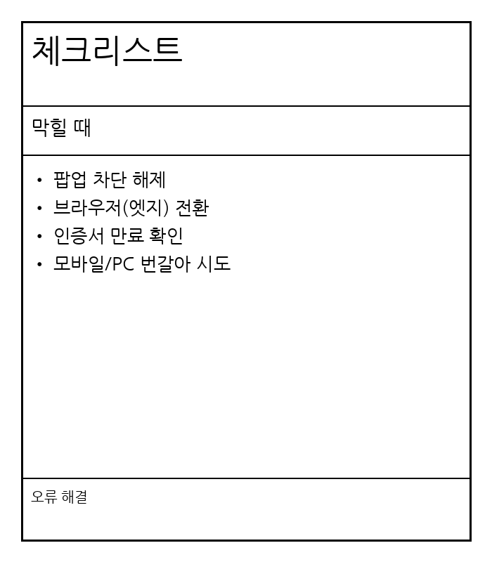 인증이 실패할 때 가장 흔한 원인은 팝업 차단, 브라우저 호환, 보안 프로그램 설치 실패입니다. 공동인증서/금융인증서가 PC에서 안 될 때는 크롬 팝업 허용을 먼저 켜고, 브라우저를 엣지로 바꿔 시도하면 해결되는 경우가 많습니다. 간편인증이 안 될 때는 휴대폰 앱에서 인증 요청이 대기 중인지(알림), 통신 상태(데이터/와이파이), 앱 업데이트 여부를 점검하세요. 또 회사 네트워크/보안 정책이 강하면 인증 모듈이 차단될 수 있어, 가능하면 개인 네트워크(테더링)로 한 번 시도해보면 원인을 분리할 수 있습니다. 그리고 인증서 “유효기간 만료”도 자주 놓치는 포인트입니다. 갑자기 안 되면 만료/갱신 여부부터 확인하세요. 마지막으로 같은 사이트라도 ‘모바일 웹/앱/PC 웹’에 따라 지원하는 인증 방식이 다를 수 있어요. PC에서 막히면 모바일로, 모바일에서 막히면 PC로 바꿔 시도하면 의외로 바로 해결되는 경우가 많습니다. 이렇게 “환경을 바꿔보는 것”이 인증 오류에서는 가장 빠른 해결책이 됩니다.