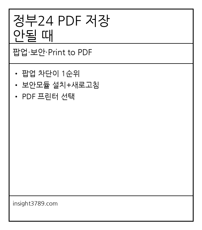 정부24에서 문서가 보이는데도 PDF 저장이 안 되거나, 출력 창이 안 뜨는 경우가 많습니다. 원인은 대부분 팝업 차단, 보안프로그램 미설치, PDF 프린터 미선택 3가지예요. 아래 순서대로 하면 대부분 해결됩니다.